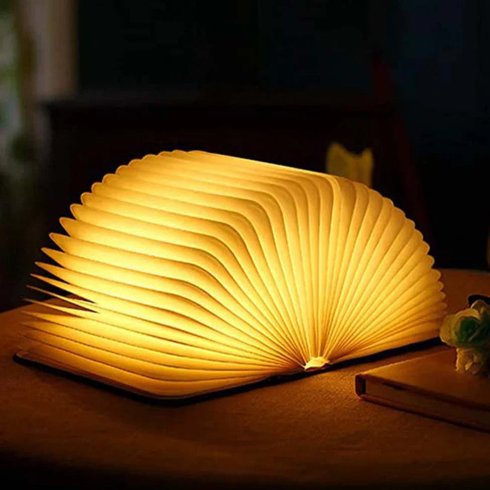 Shaped like an open book, this lamp unfolds to reveal a soft, warm white LED light, creating a cozy ambiance.