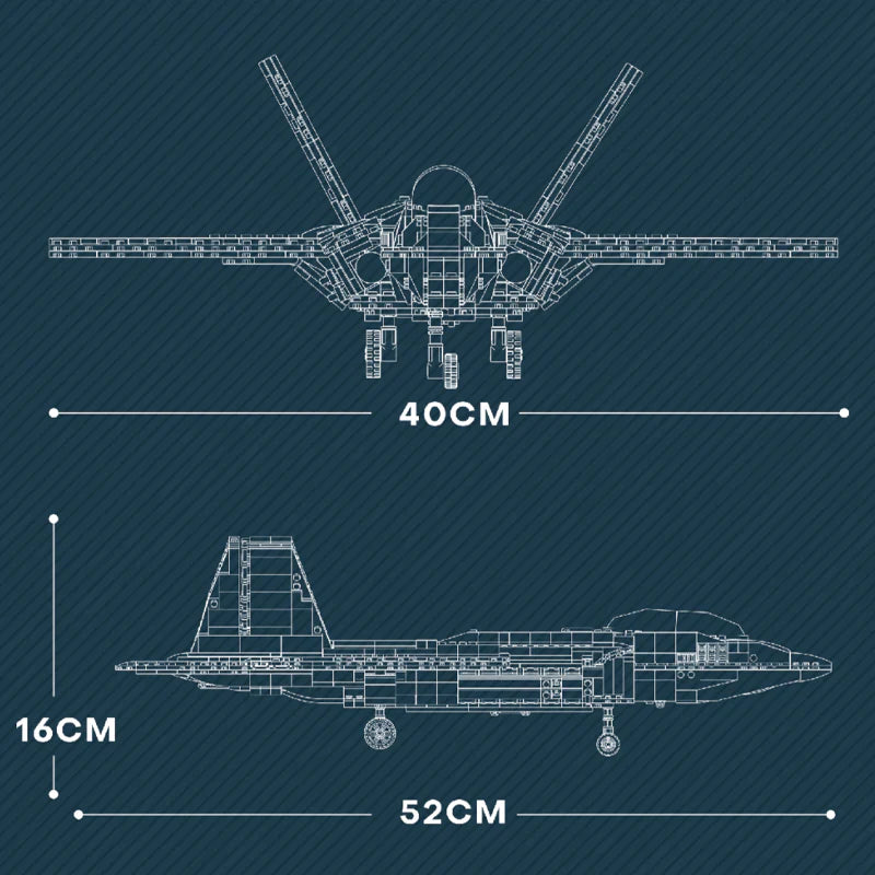 1.  Dimensions: Approximately 52 cm (L) x 40 cm (W) x 16 cm (H), capturing the sleek profile of the F-22.