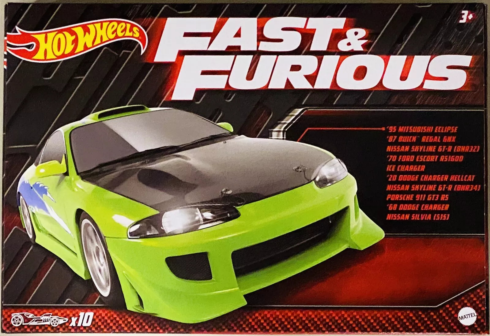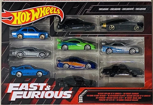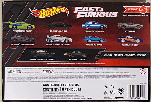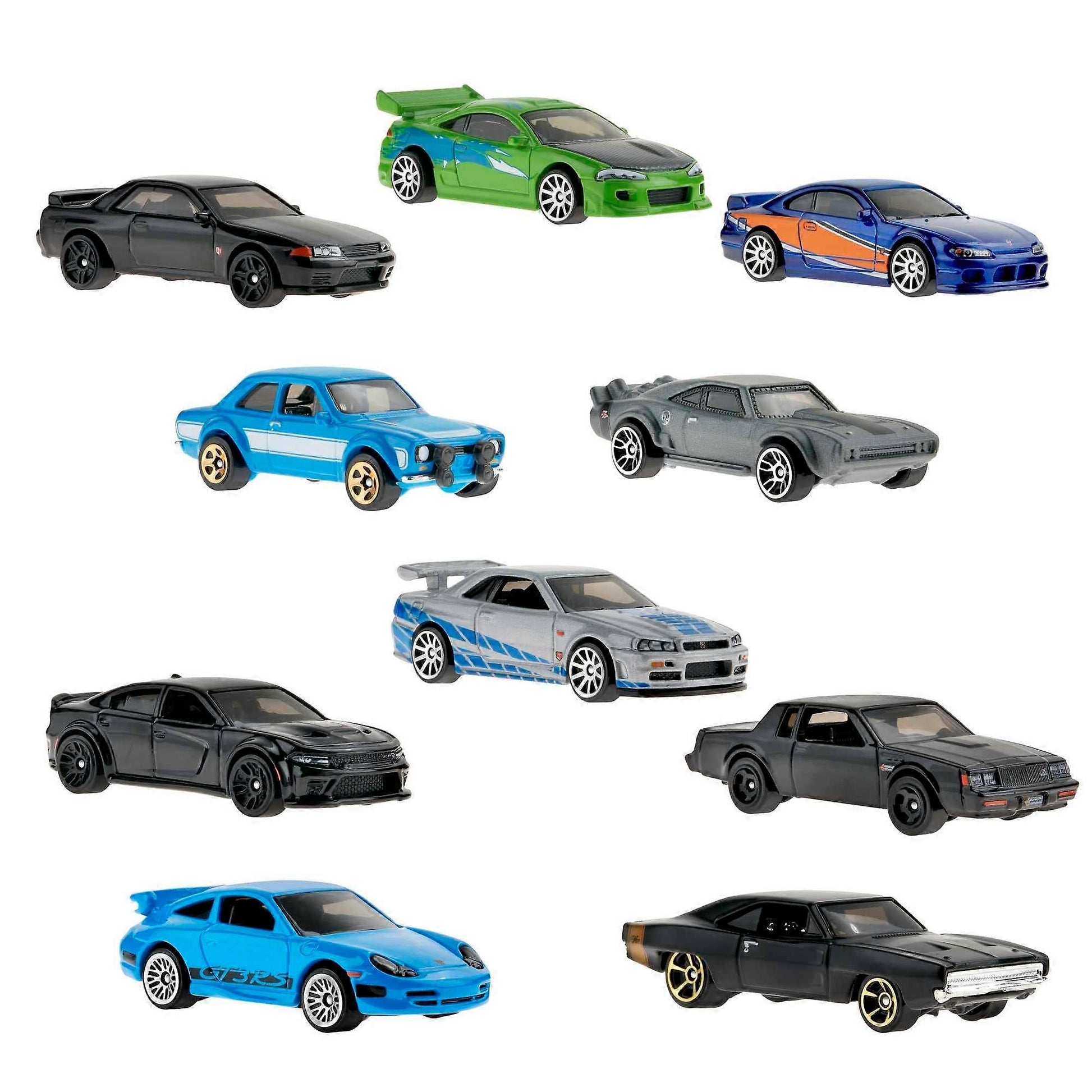 Includes ten legendary cars from the Fast & Furious franchise, such as the Nissan Skyline, Dodge Charger, and Mitsubishi Eclipse, all featuring detailed designs.