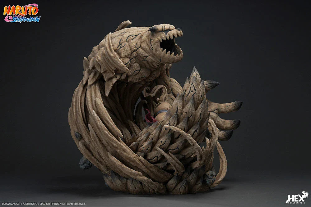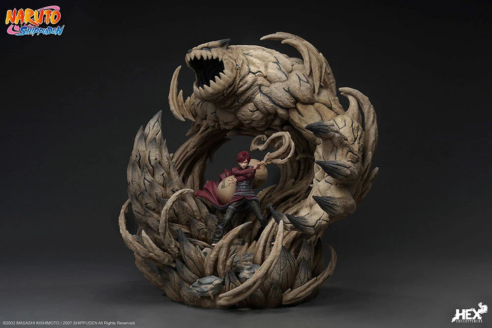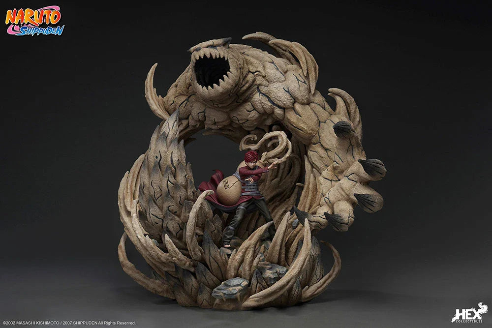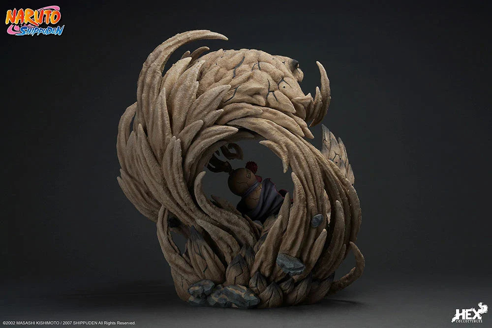 A huge gourd tied on the back, Gaara wears a long-sleeved crimson robe standing firmly on the sand and stones. The Fifth Kazekage stares at his enemy with a stern look and manipulates the sand rushing out of the base and his gourd, which adds a powerful feeling to the statue. Behind Gaara, the One-Tailed Shukaku waves its sharp claws and howls angrily to the sky.