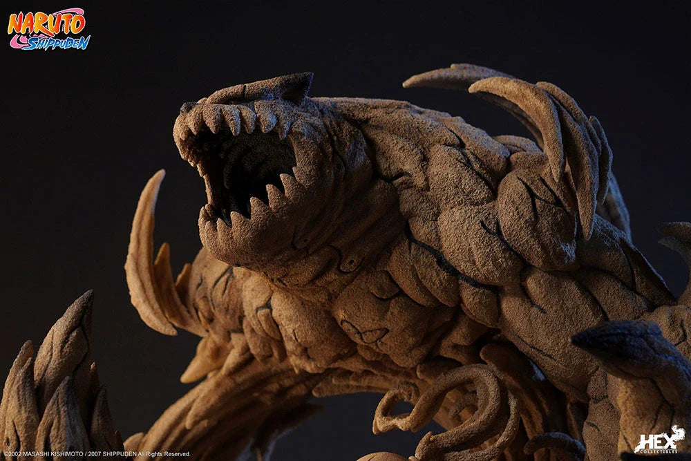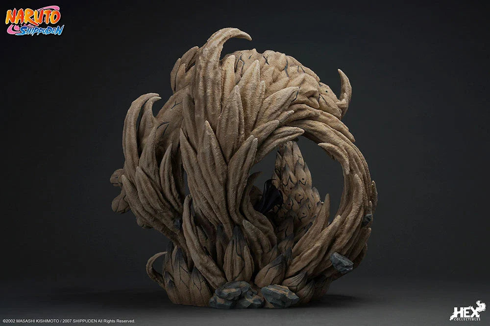 This monstrous Tanuki is fully sculpted in the likeness of its anime appearance, with realistic gravel textures and black cursed seal markings all over its massive sandy-brown body and tail. The fluid design as well as clouds of dust made by the One-Tailed Shukaku complement and epitomize a nervous but exciting battle scene for collectors.