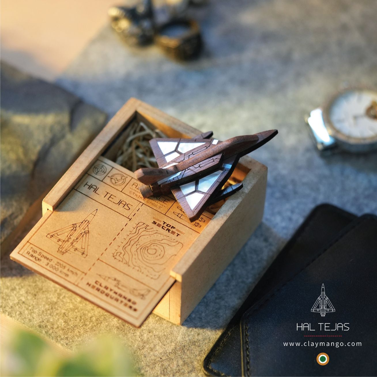 The brooch, part of the Fighter Jet Collectible Series, is a detailed representation of the Tejas, showcasing its sleek and modern design. Crafted with mother of pearl and wood, this brooch exudes elegance while celebrating the technological prowess of one of India’s most iconic aircraft.