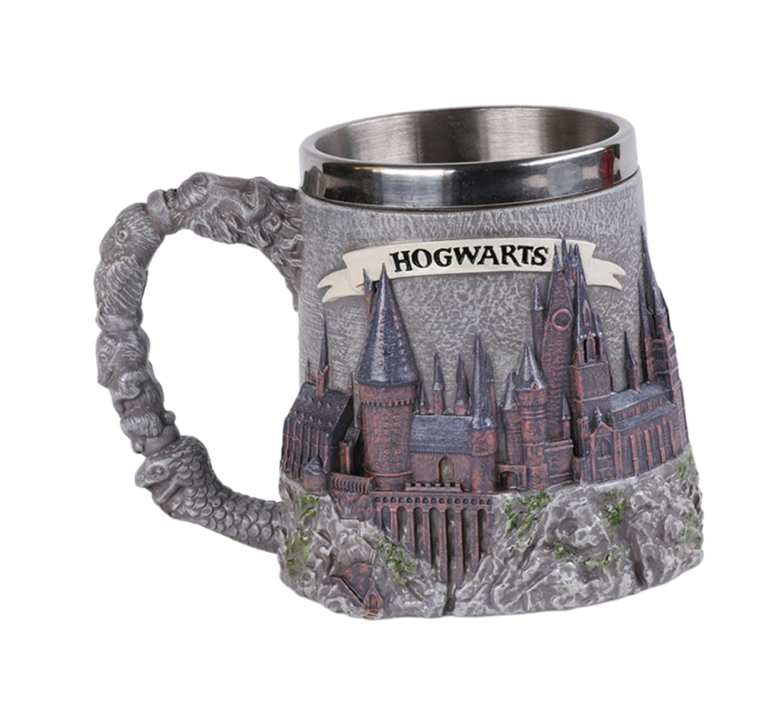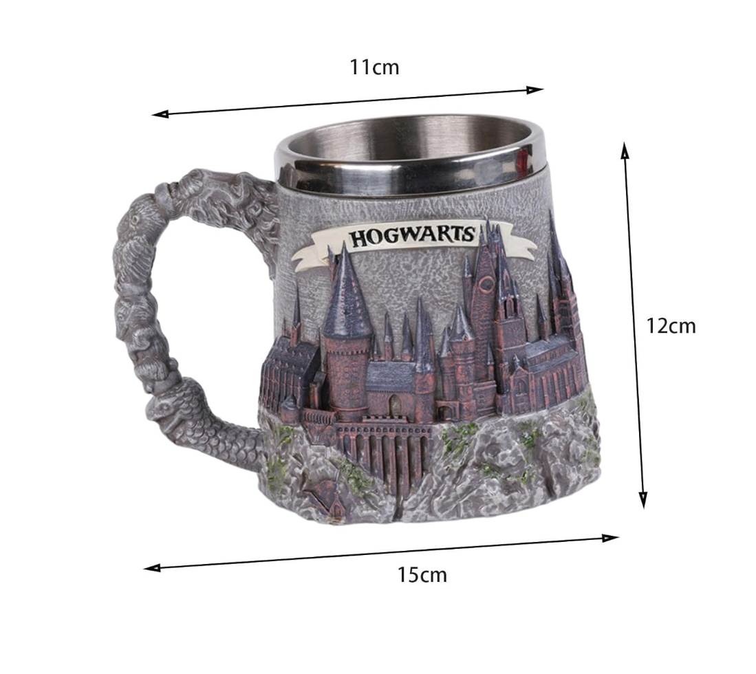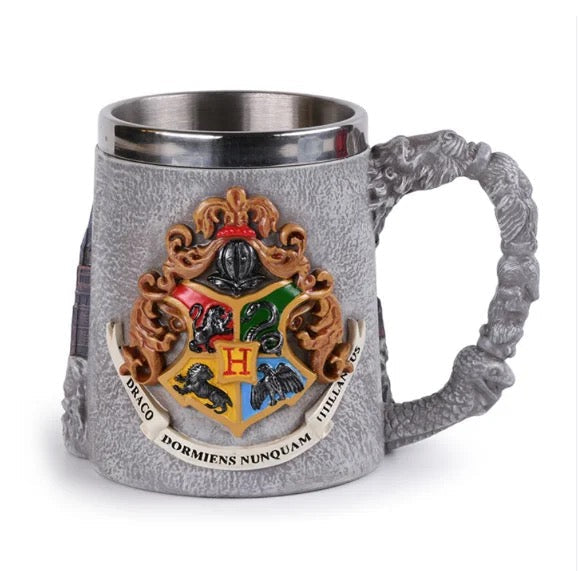 The exterior showcases the iconic Hogwarts crest, featuring the four house animals and the school motto "Draco dormiens nunquam titillandus" ("Never tickle a sleeping dragon").