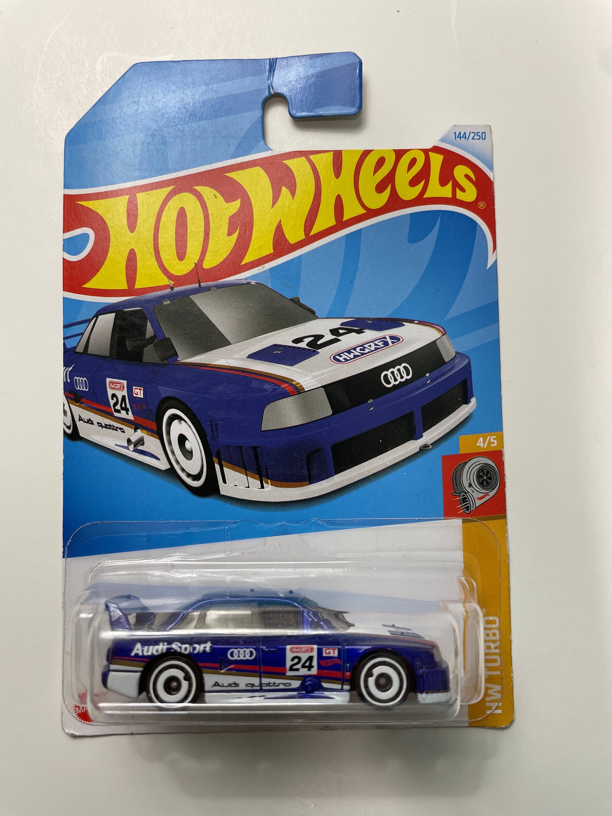 This 1:64 scale die-cast model of the Audi 90 Quattro by Hot Wheels features a bold blue body with white and red racing stripes, authentic sponsor decals, and the iconic “Audi Sport” and “quattro” branding. Part of the HW Turbo series (4/5), it captures the rally-inspired design and aggressive stance of the original vehicle. The packaging card is damaged, making it a more affordable option for collectors who open their cars or don't mind imperfections in packaging.