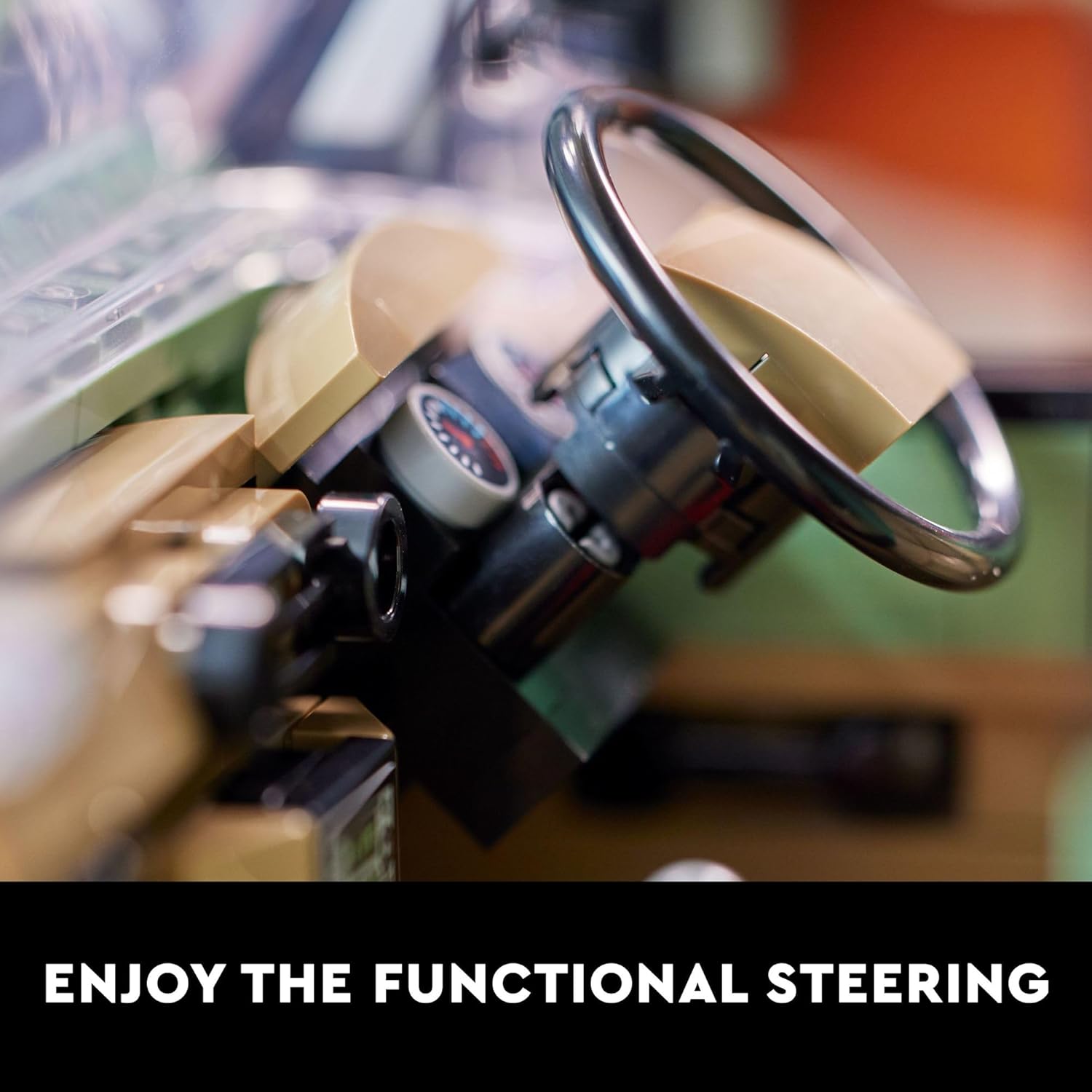 The LEGO Icons Land Rover Classic Defender 90 (10317) boasts an incredibly detailed design that faithfully replicates the classic 4x4 vehicle. The set includes functional features like a working steering wheel, opening doors, and a realistic suspension system, enhancing the model’s authenticity. Every aspect of the Defender, from its rugged exterior to its intricate interior, is meticulously crafted to provide an accurate and visually appealing representation. This attention to detail makes the set not only a rewarding build but also a true collector's item for Land Rover enthusiasts and LEGO fans alike.
