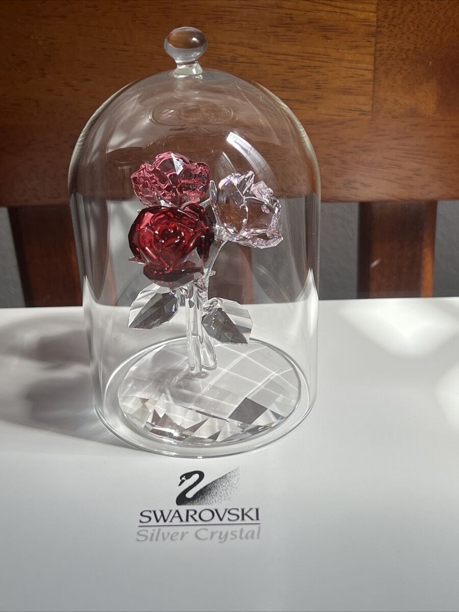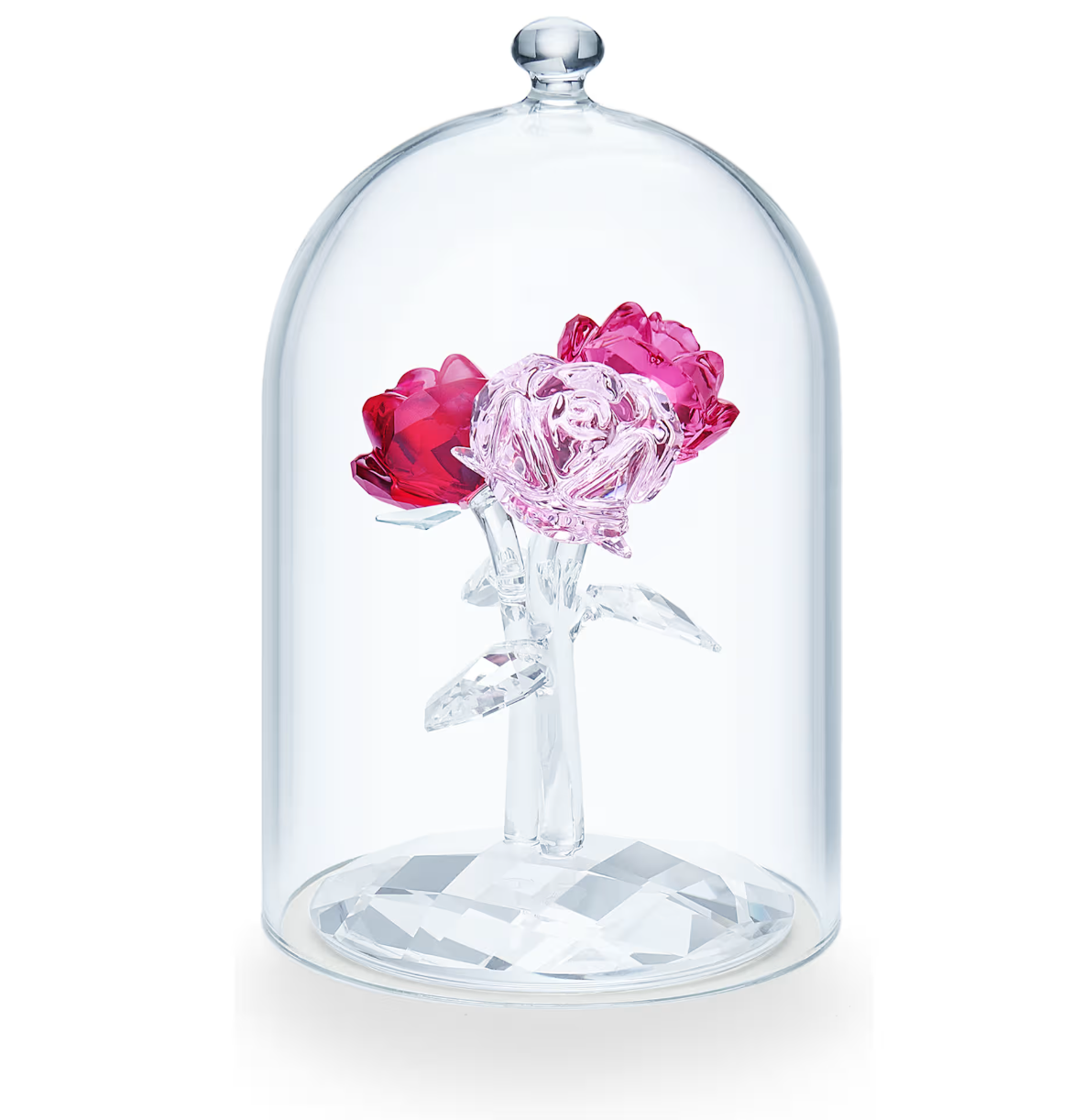 1.  Design: The Rose Bouquet features three delicate roses in a gradient of pinks, crafted with 451 facets. It can be displayed with or without the included bell jar, adding a touch of elegance to any room.