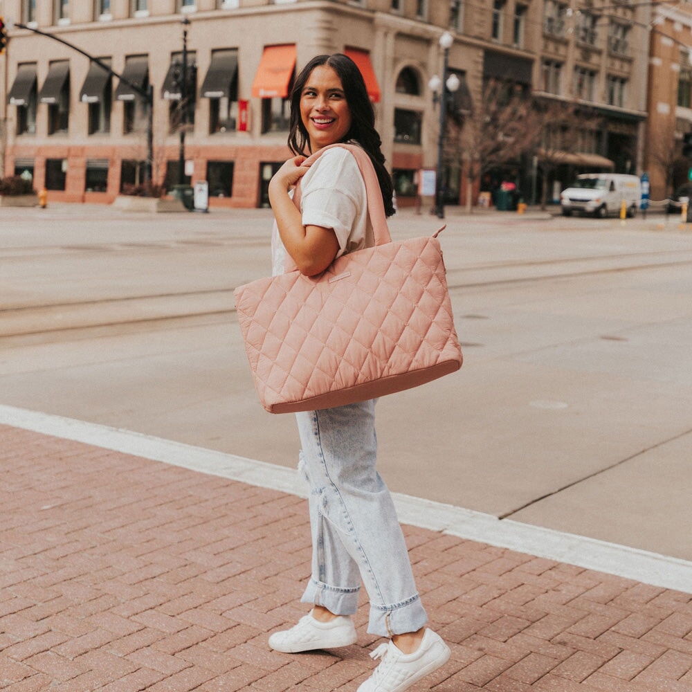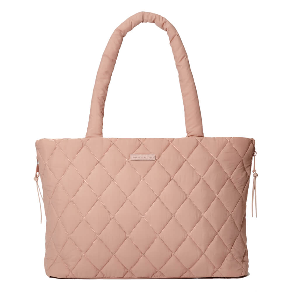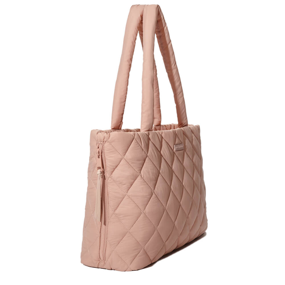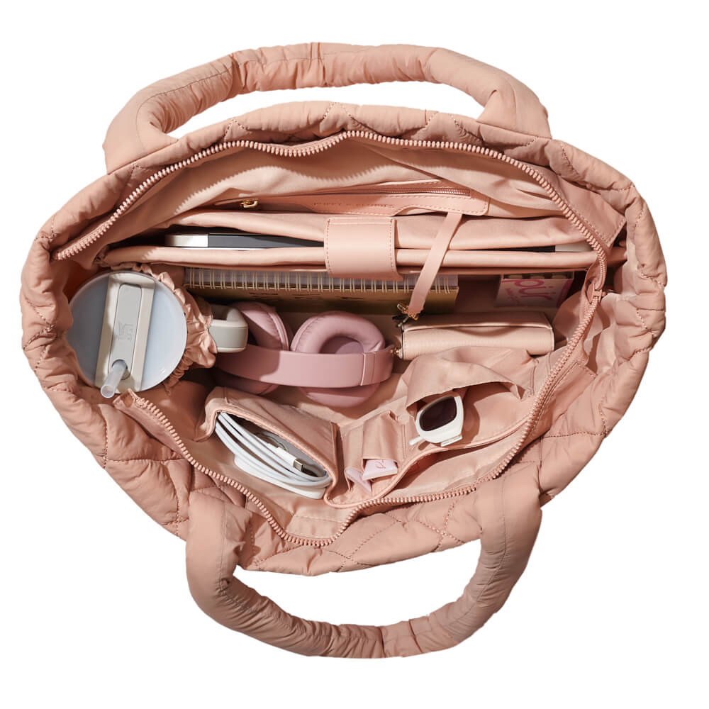 Crafted from quilted washed nylon with an interior lining made from recycled plastic bottles, reflecting the brand's commitment to sustainability.