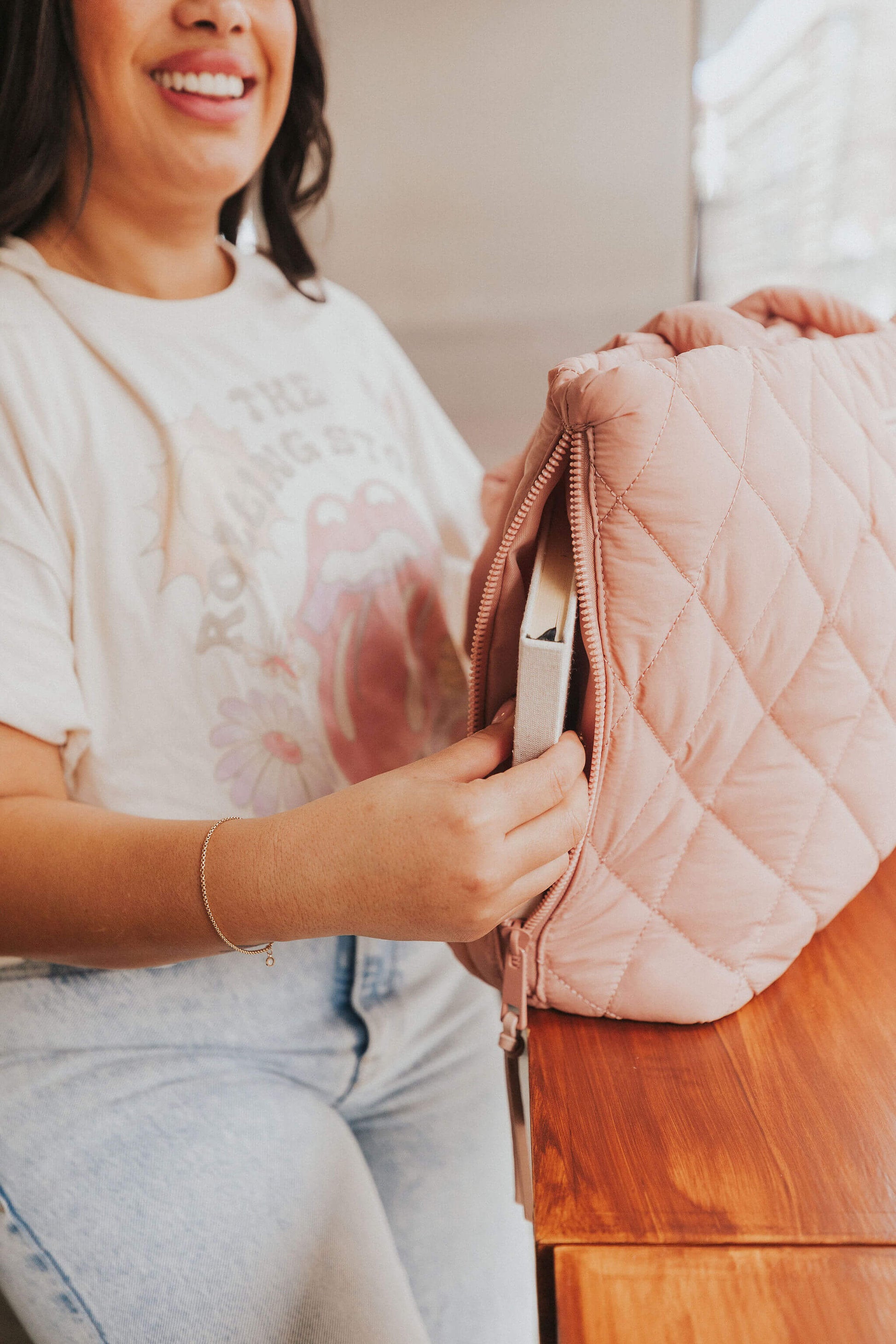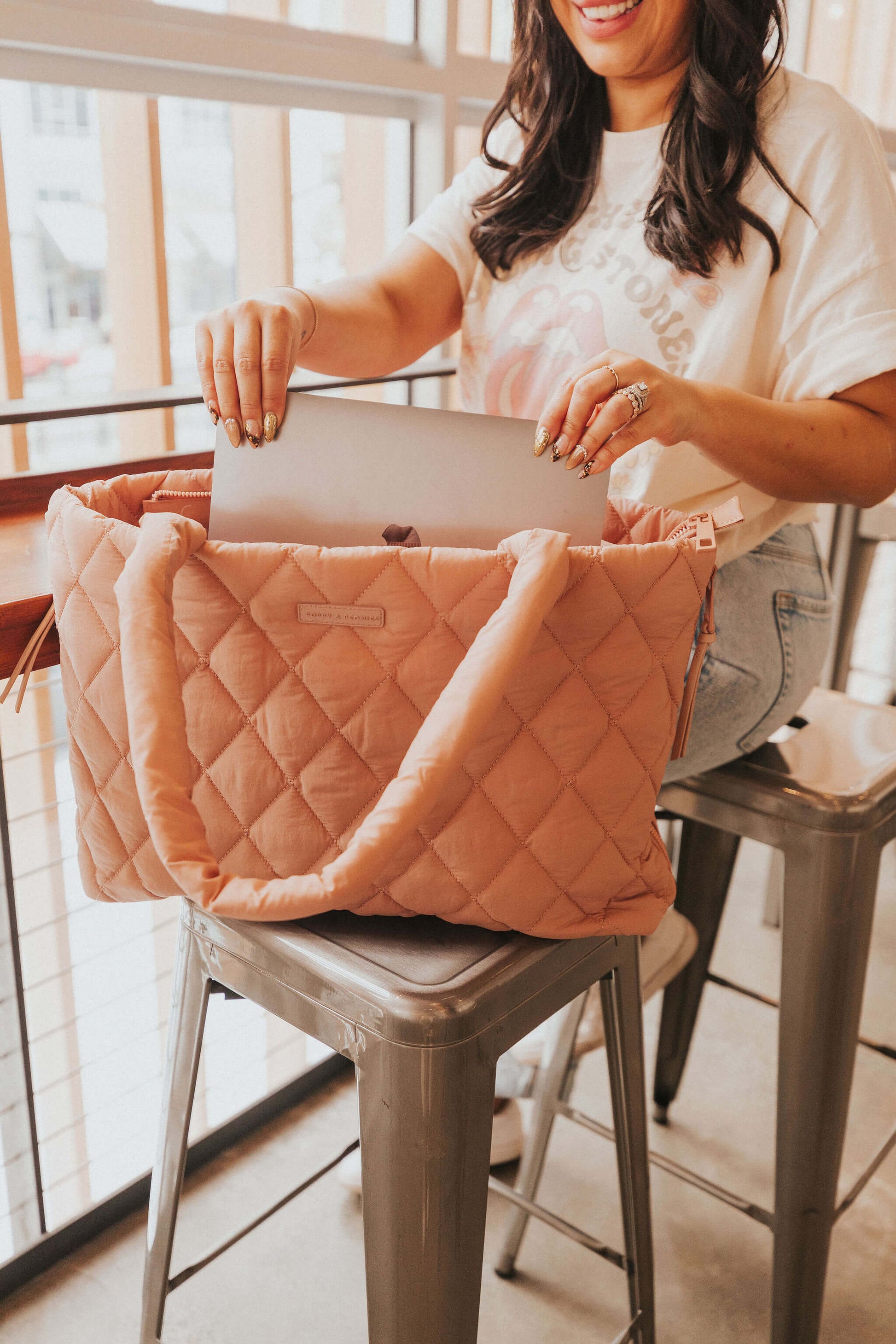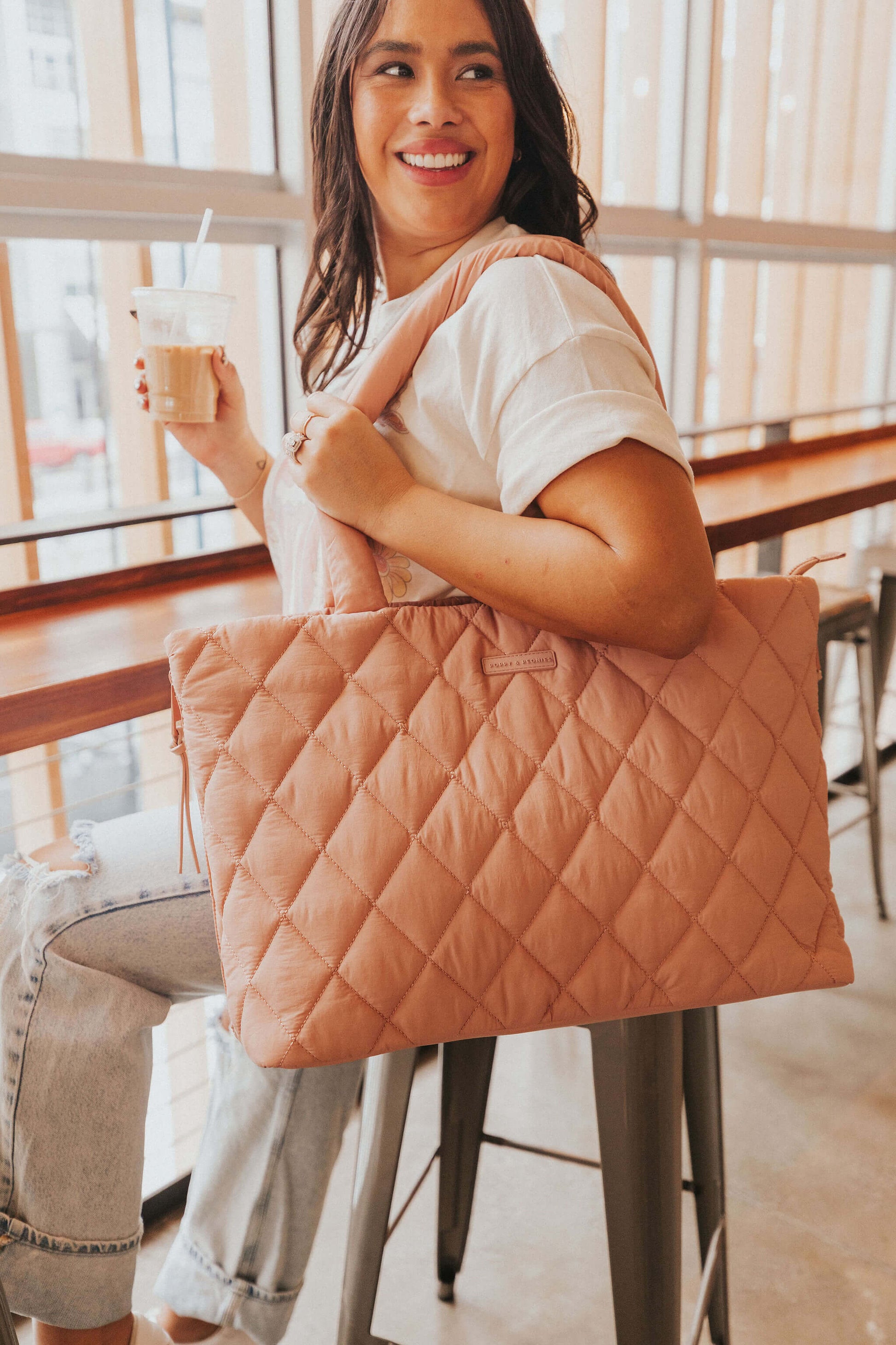 Crafted from quilted washed nylon with an interior lining made from recycled plastic bottles, reflecting the brand's commitment to sustainability.