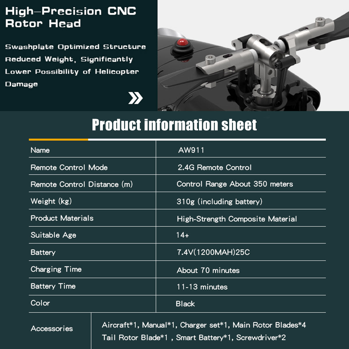 Item No.: AW-911 (Airwolf nine-channel intelligent 6G aileronless simulation helicopter) Brand: WOLFBUSH Material: high strength composite engineering material; Color: as shown in the picture; Rotor diameter: 375mm; Fuselage length: 415mm; Height: 118mm; Weight: single airplane weight 310g; Drive motor: 2511 1200KV brushless motor; Lock tail motor: 1204 5500KV brushless motor; Servo: 4.3g metal digital servo; Remote control: 2.4G remote control; Remote control distance: more than 120 meters; Body battery: LI-POLY smart battery 7.4V(1200MAH) 25C; Charger: USB charger; Charging time: about 60 minutes; Use time: 10-12 minutes.